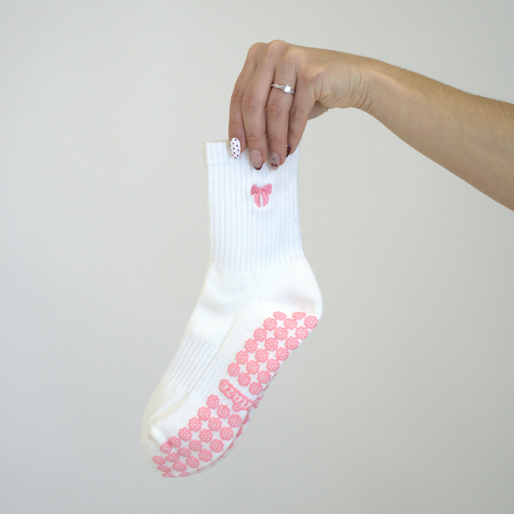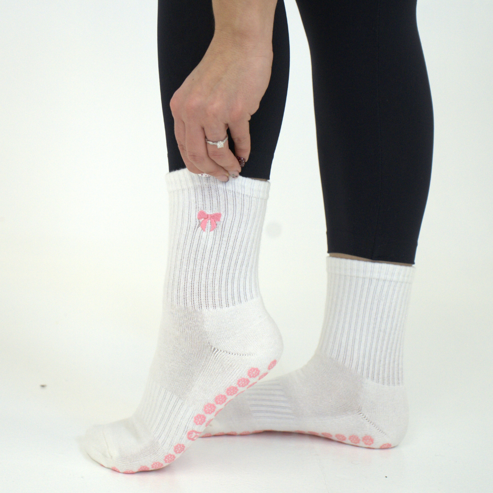 Pretty in blush pink, Bow Babe brings a touch of ballet-inspired charm to your studio look. Finished with a dainty embroidered bow, these pilates grip socks the perfect mix of playful and practical.